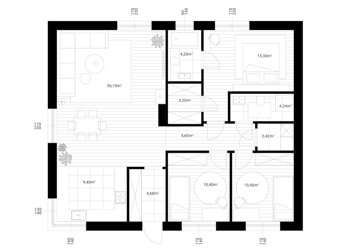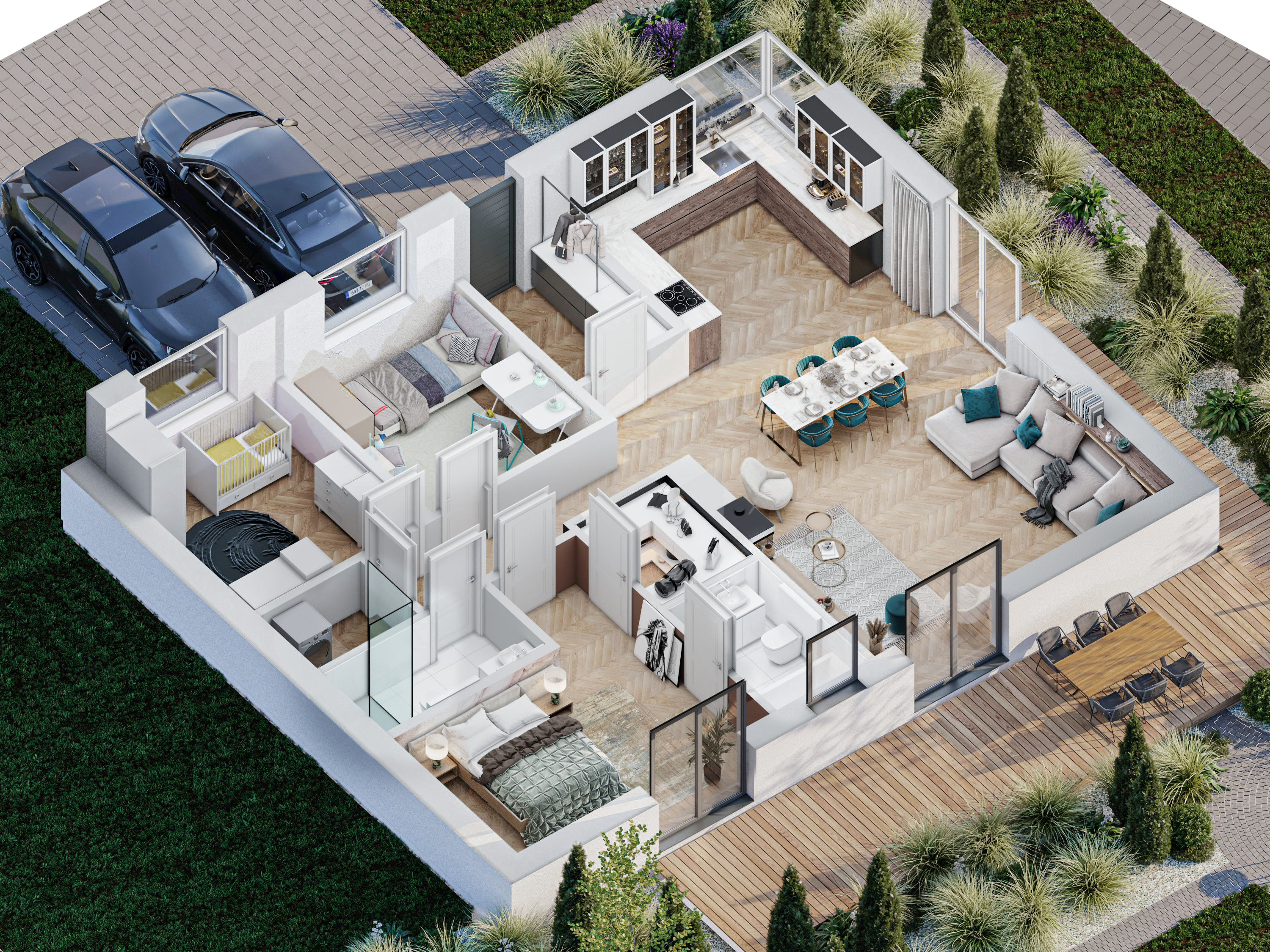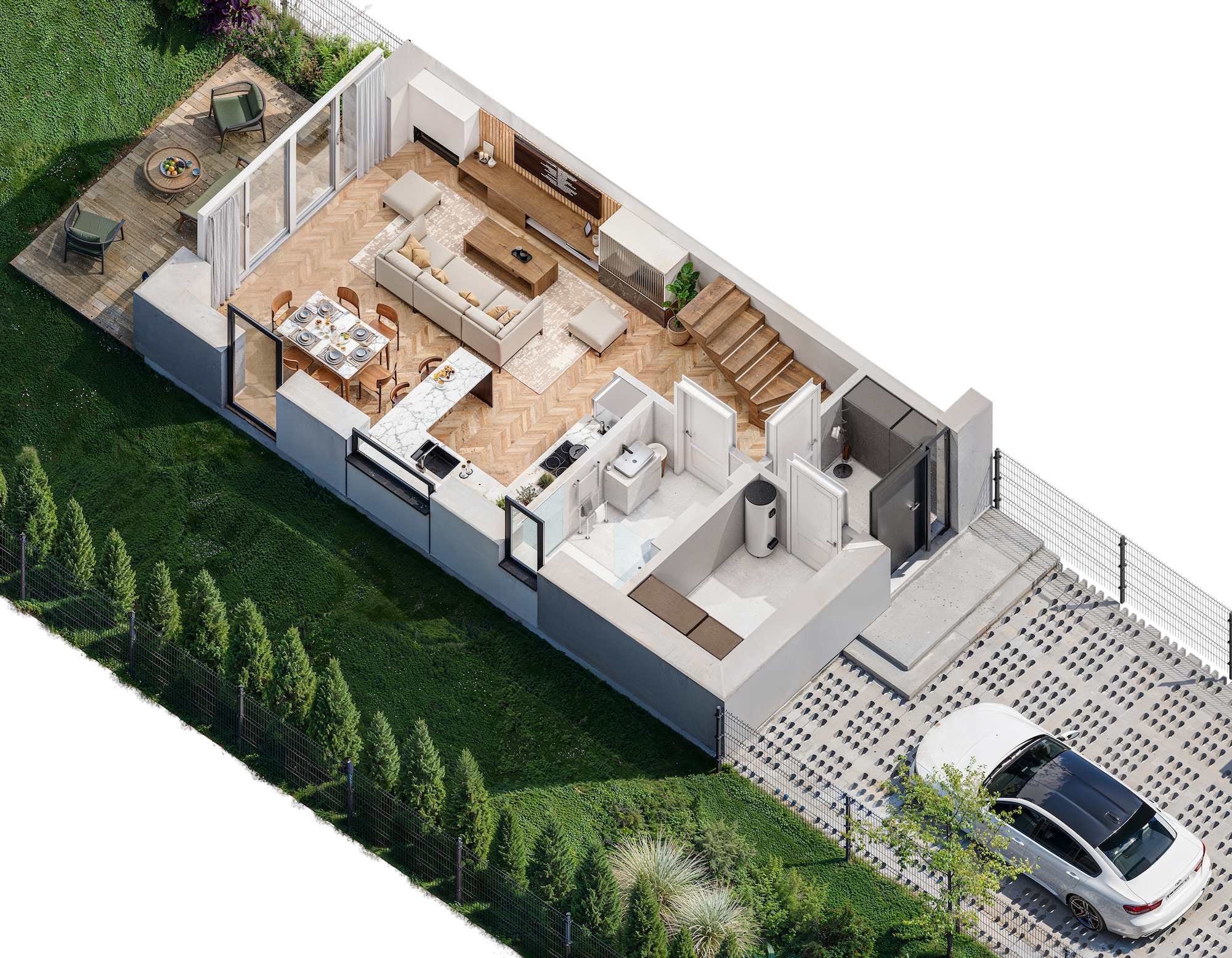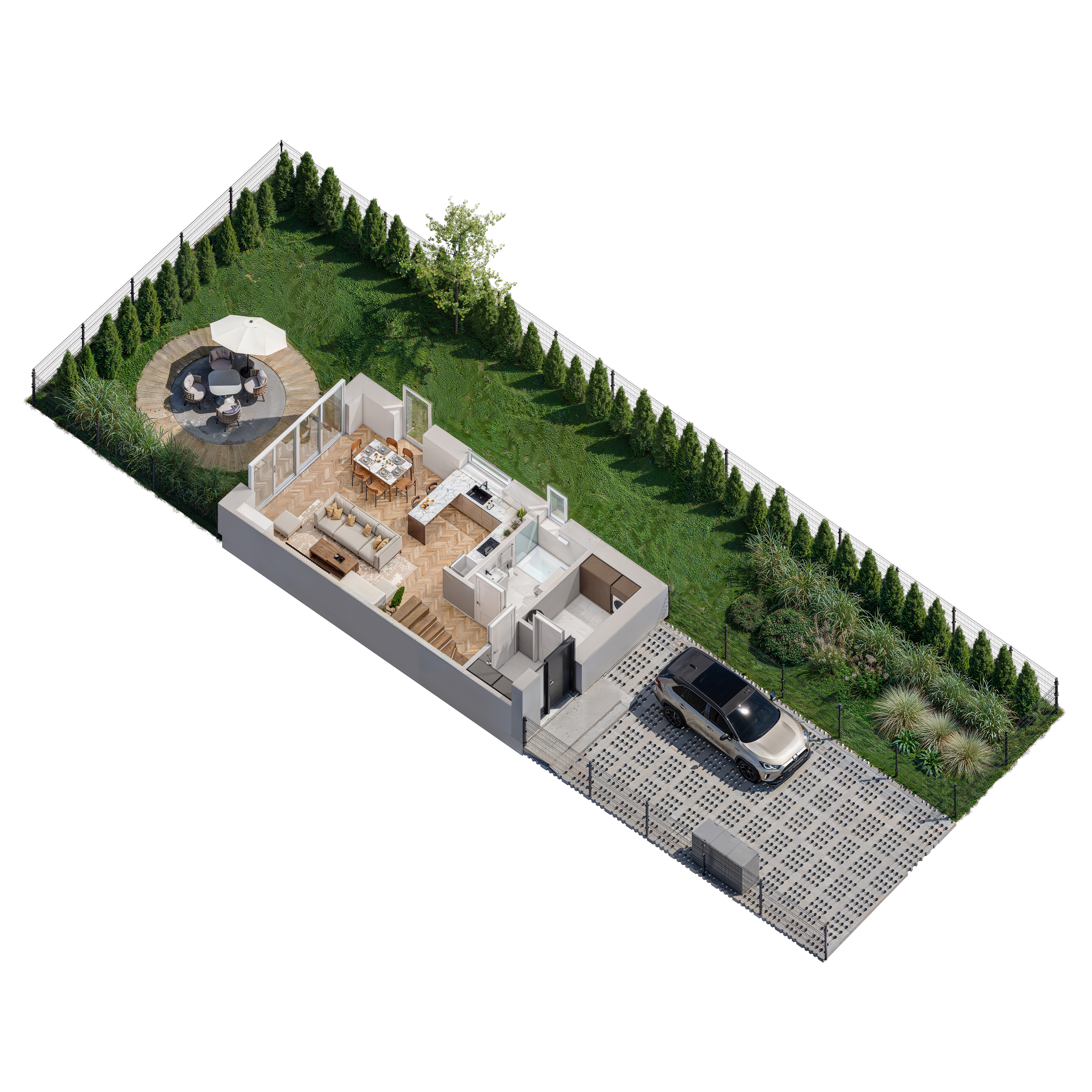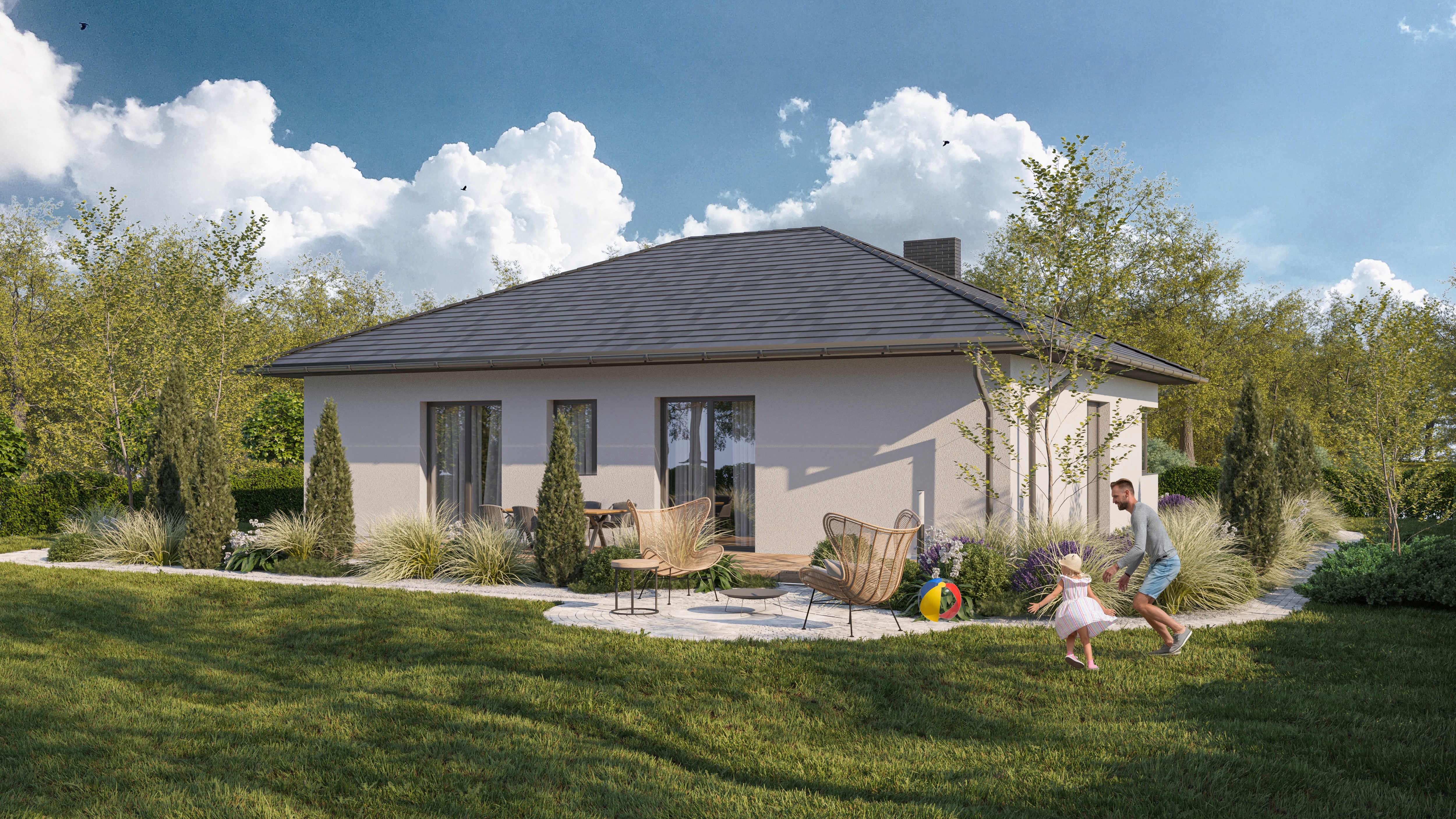 Duże przeszklenia gwarantują doskonałe doświetlenie wnętrz, a przemyślany układ zapewnia wygodę codziennego życia. Projekt wyróżnia się nowoczesną architekturą, energooszczędnymi rozwiązaniami i wysokim standardem wykonania.